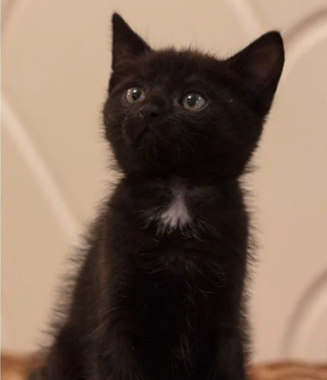 Черный котенок с белым пузом