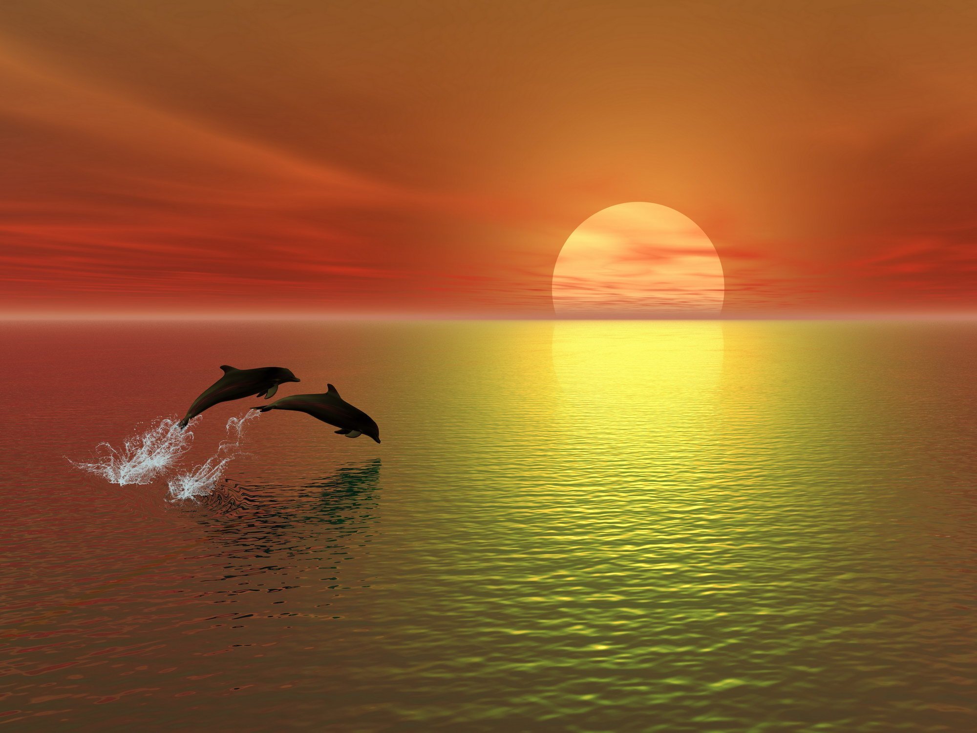 Красивый закат на море с дельфинами