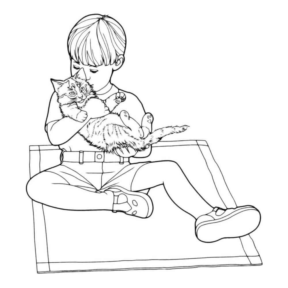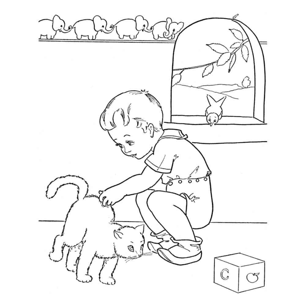 Мальчик с котенком раскраска